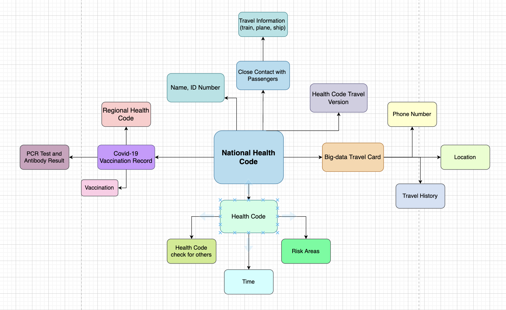 This chart demonstrates that the data collected by Health Code is very extensive. In addition to collecting data on individual users, the personal statement will also influence by the results of the data which according to the actual situation in society. The data structure of the personal Health Code contains four main components: basic personal information; personal health information; trip information; and health certificate information.