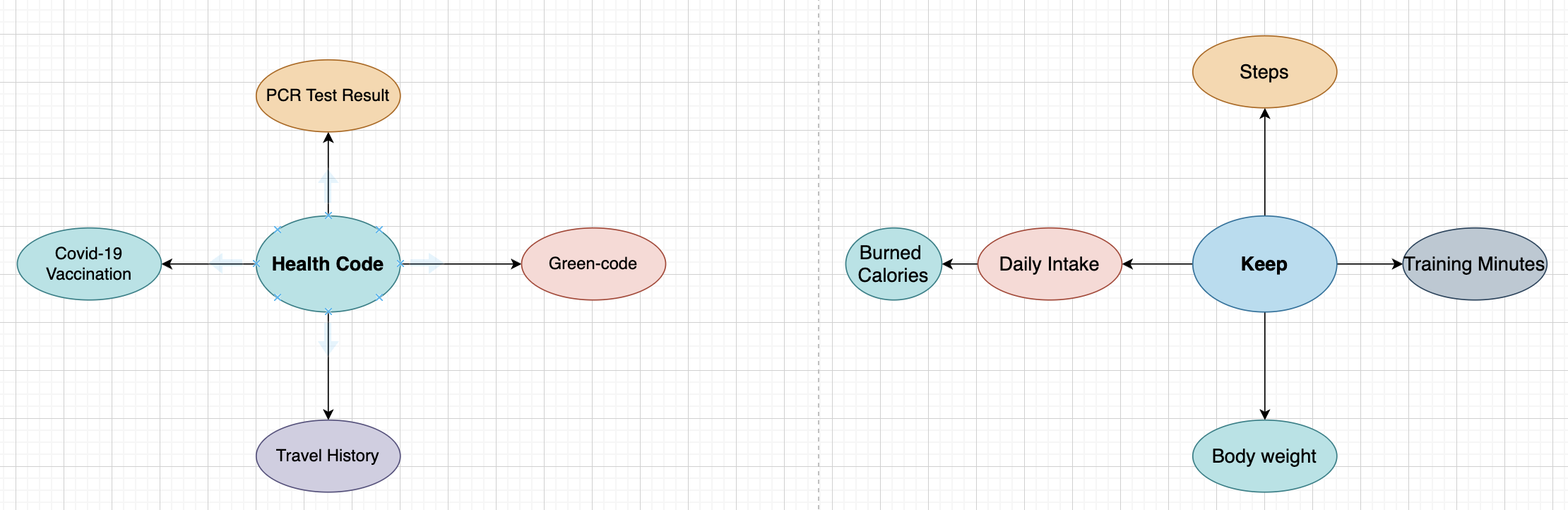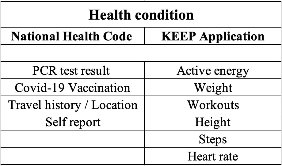 This chart shows that the Health Code definition of health is based on an individual's risk of viral infection in a pandemic era, and the KEEP application is based on an individual's self-declared physical information and the completion of an exercise plan.