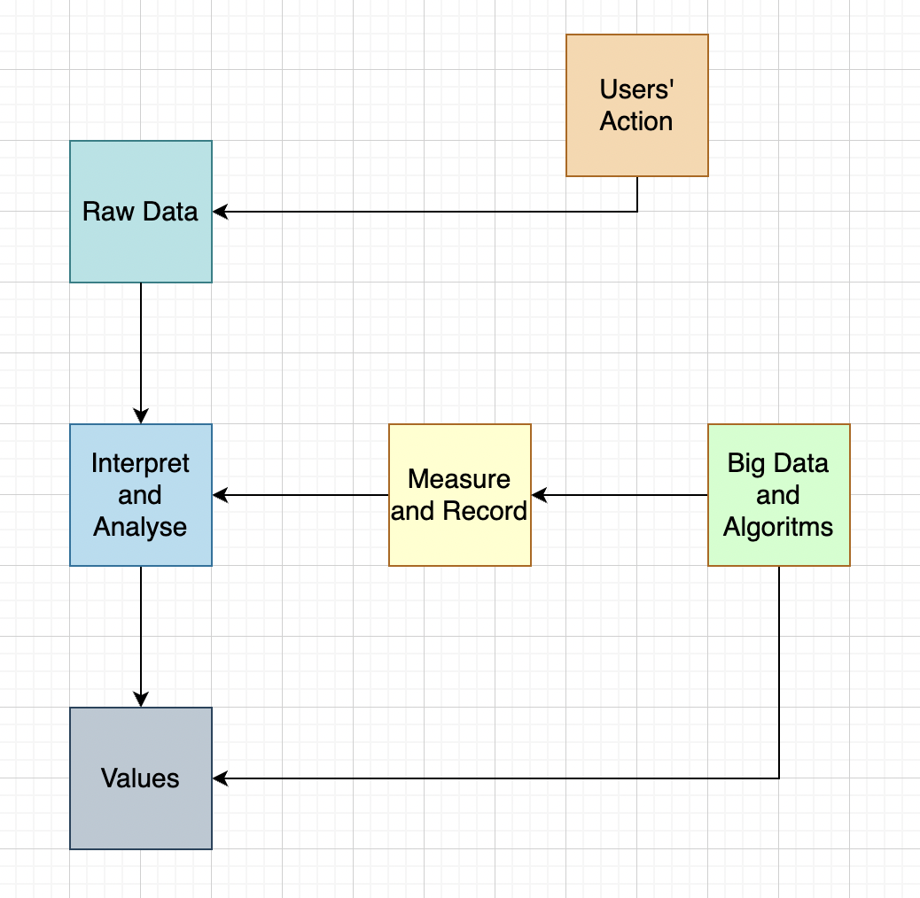 This flow chart shows the process of datafication can therefore be divided into two steps, firstly transforming the research object into data which we consider as raw data, and then interpreting and analysing the raw data in order to apply value to data.