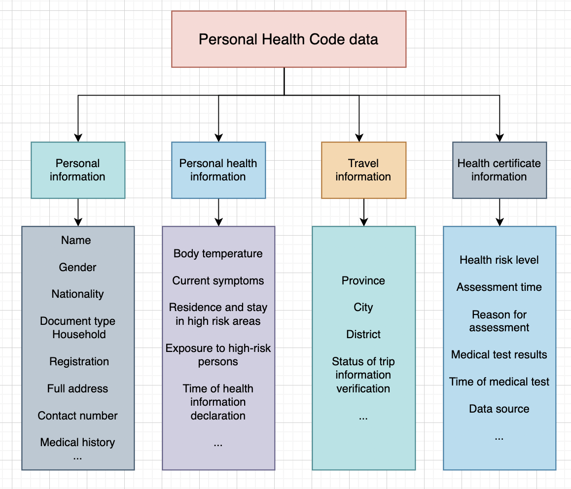 This chart demonstrates that the data collected by Health Code is very extensive. In addition to collecting data on individual users, the personal statement will also influence by the results of the data which according to the actual situation in society. The data structure of the personal Health Code contains four main components: basic personal information; personal health information; trip information; and health certificate information.